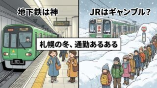 ひとりごと 地下鉄は神、JRはギャンブル?札幌の冬、通勤で見せる「悟り」の境地 札幌の冬の通勤は毎日がドラマ!絶対に止まらない「地下鉄の神」と、大雪で一喜一憂する「JRギャンブル」、雪山に消えるバス停など、道民が静かに耐え忍ぶ通勤あるあるをまとめました。読めば吹雪の日の通勤も、少しだけ笑えるかも? 2026.01.25 ひとりごと生活