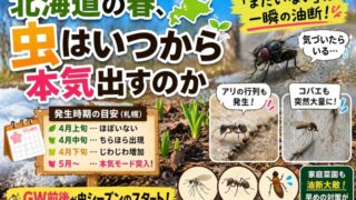 ひとりごと 北海道の春、虫はいつから本気出すのか 北海道の春、虫はいつから出るのか?札幌を基準に4月〜5月の発生時期や気温との関係を解説。コバエ・アリなど春に増える虫と、家庭菜園で注意すべきタイミングも紹介します。 2026.04.17 ひとりごと生活