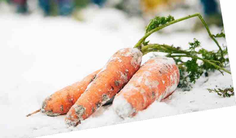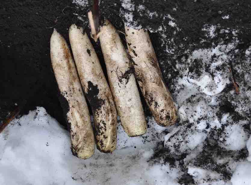 - にんじん:雪解け〜3月下旬〜4月(春先)に掘り出すと甘みが増している。凍結していない日を選ぶ。