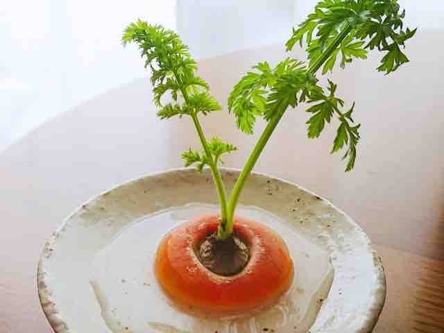 人参の上部(ヘタ)を1cmほど切って皿に置き、浅く水を張ります。