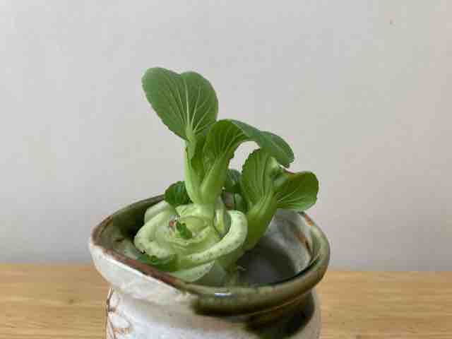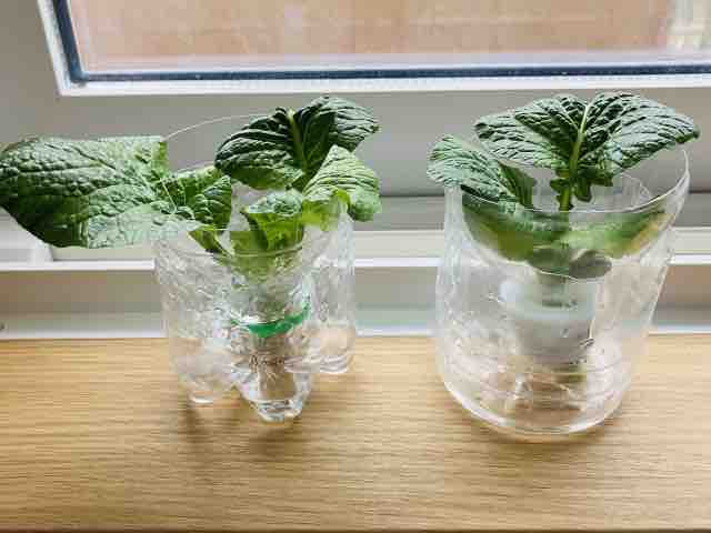 これは、スーパーで買った野菜の根や芯を水に浸けて、もう一度育てる再生栽培のこと。