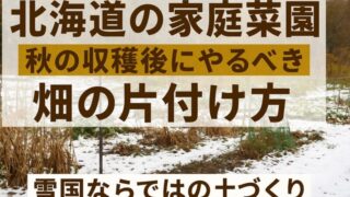 家庭菜園 北海道の家庭菜園|秋の収穫後にやるべき畑の片付け方と雪国ならではの土づくり 北海道の家庭菜園向けに、秋の収穫後の畑の片付け方を詳しく解説。残渣処理・支柱撤去・雪解け水対策・寒ざらし土づくりなど、雪国ならではのポイントを押さえ、翌年の豊かな収穫につなげましょう。 2025.09.30 家庭菜園